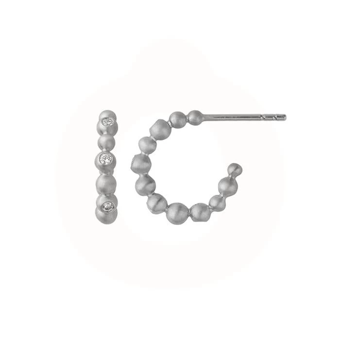 Små creoler med kugler udført i sterlingsølv med hvide zirkoner. Vibholm guld og sølv er autoriseret forhandler af byBiehl smykker.