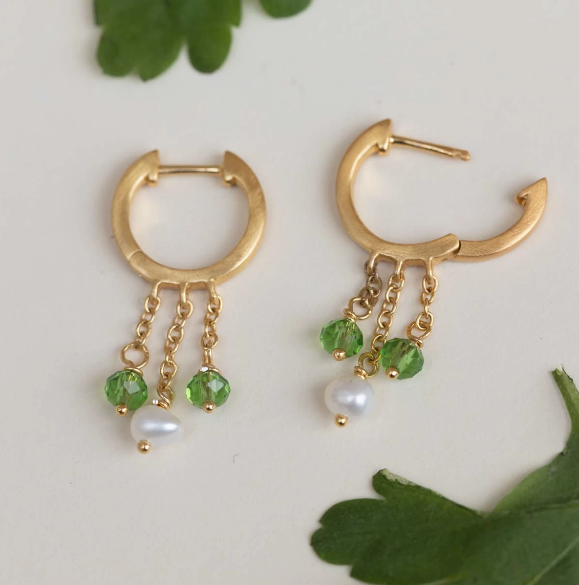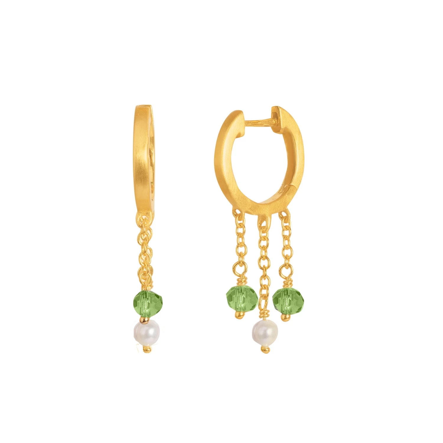 Disse øreringe er udført i 14 karat forgyldt sterlingsølv og er det perfekte tilbehør til enhver lejlighed. Øreringene er udsmykket med en hvid ferskvandsperle og to farvede krystal i hver ørering. Øreringene vil være et smukt og alsidigt tilbehør, som kan bruges til hverdag eller festlige lejligheder.