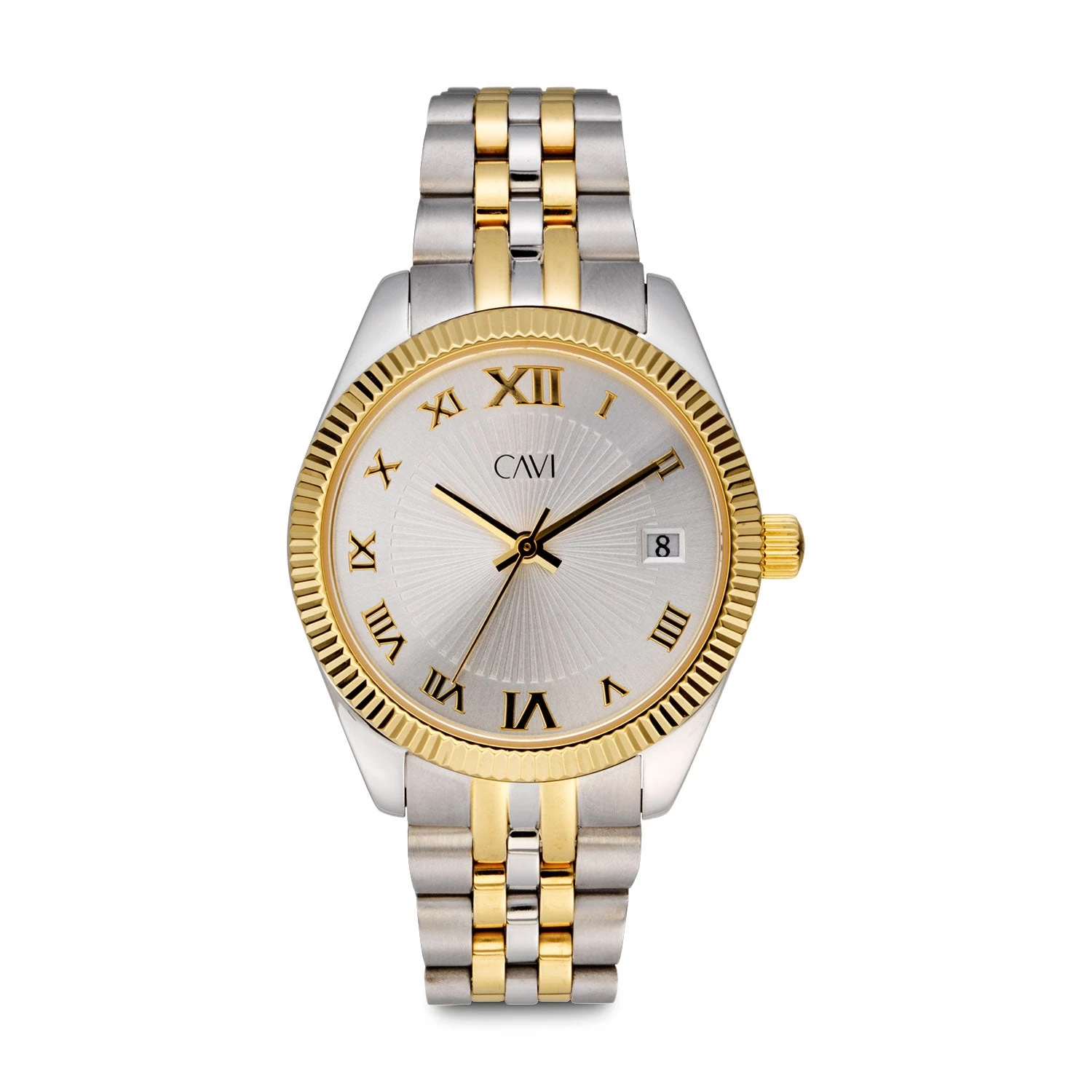 Armbåndsur til kvinder fra CAVI udført i bi-color rustfrit stål med sølv urskive. Uret har datovisning og glasmaterialet er safirglas, hvilket gør det stort set umuligt at ridse. Uret er 5 ATM, hvilket ikke gør det egnet til at bade med, men det kan sagtens tåle en smule vand.