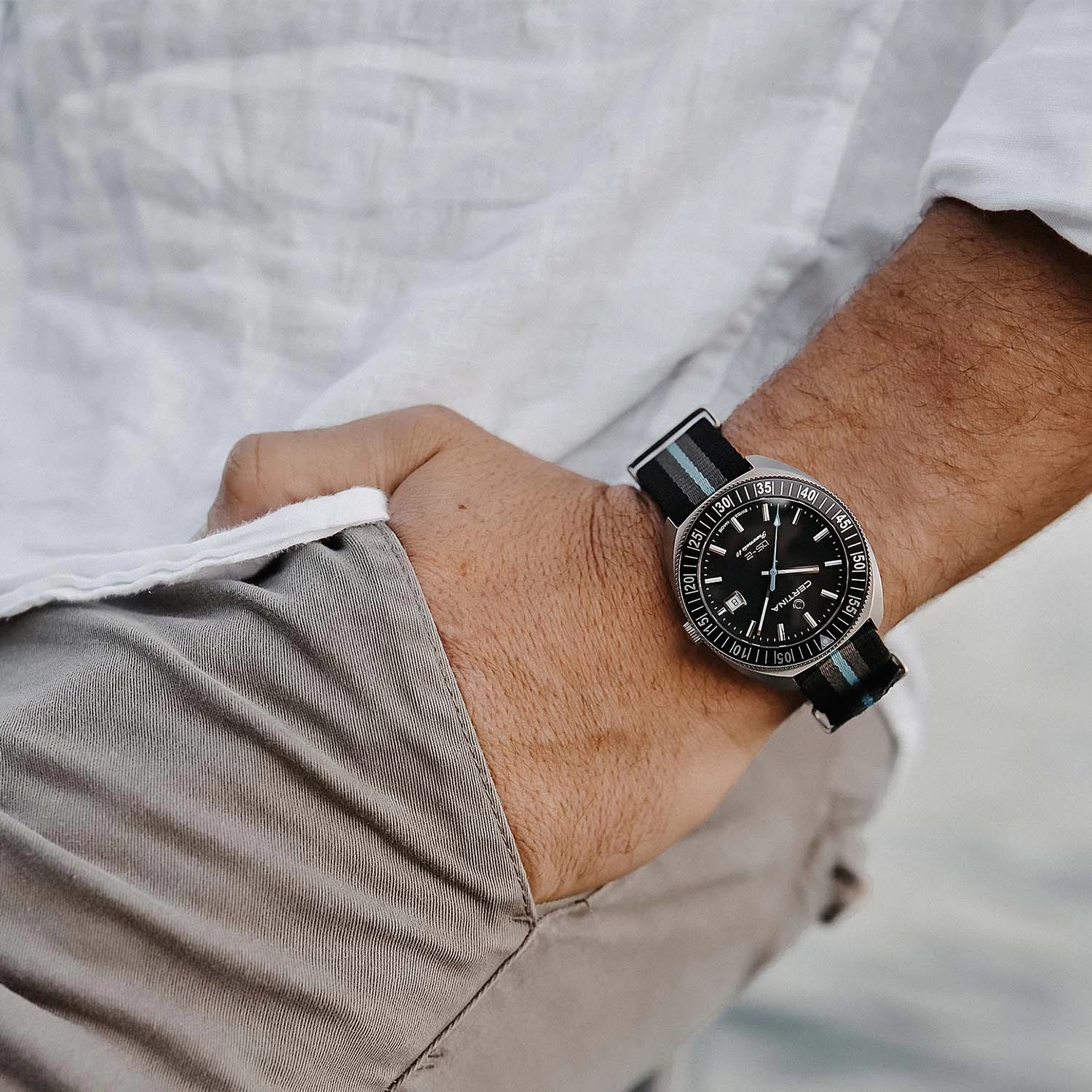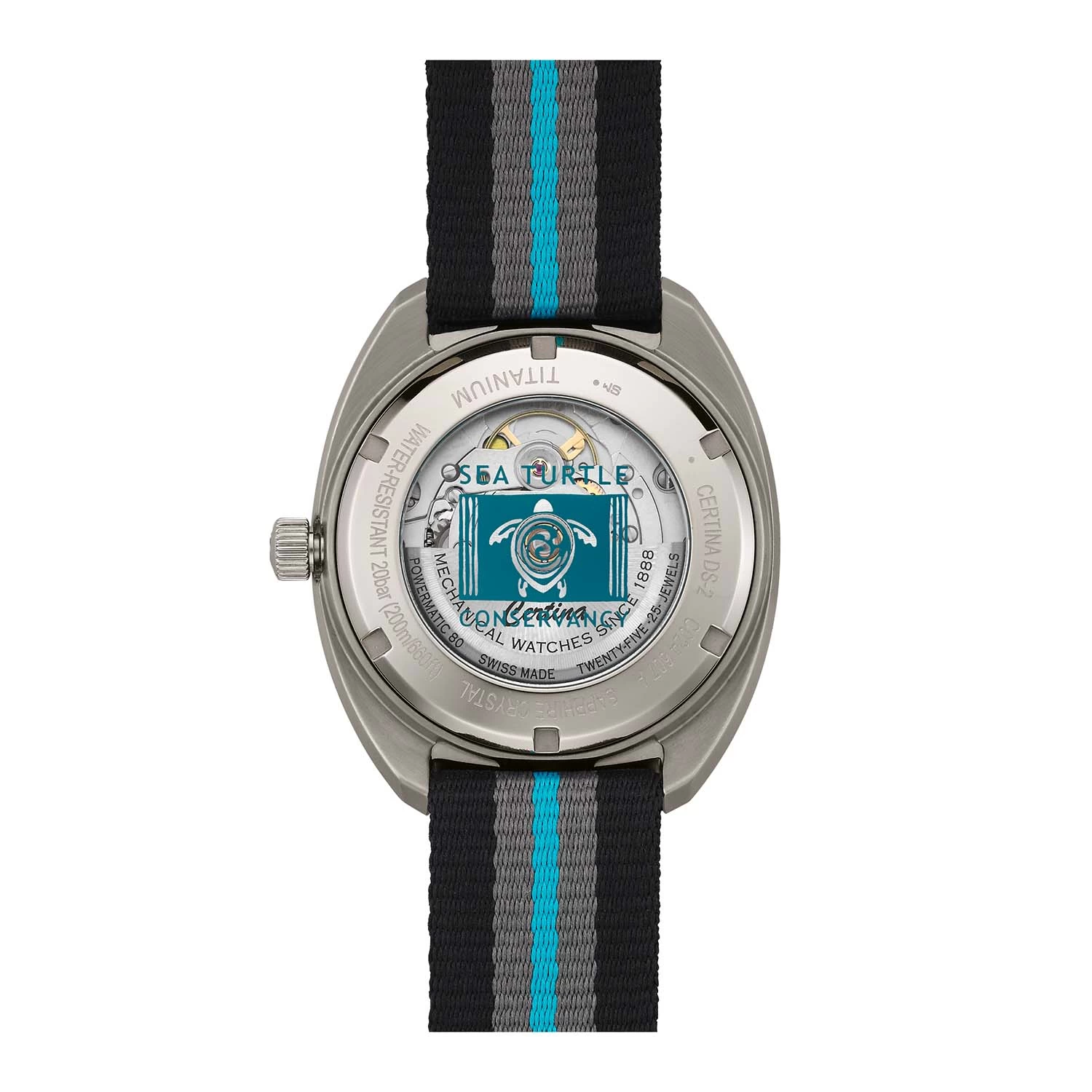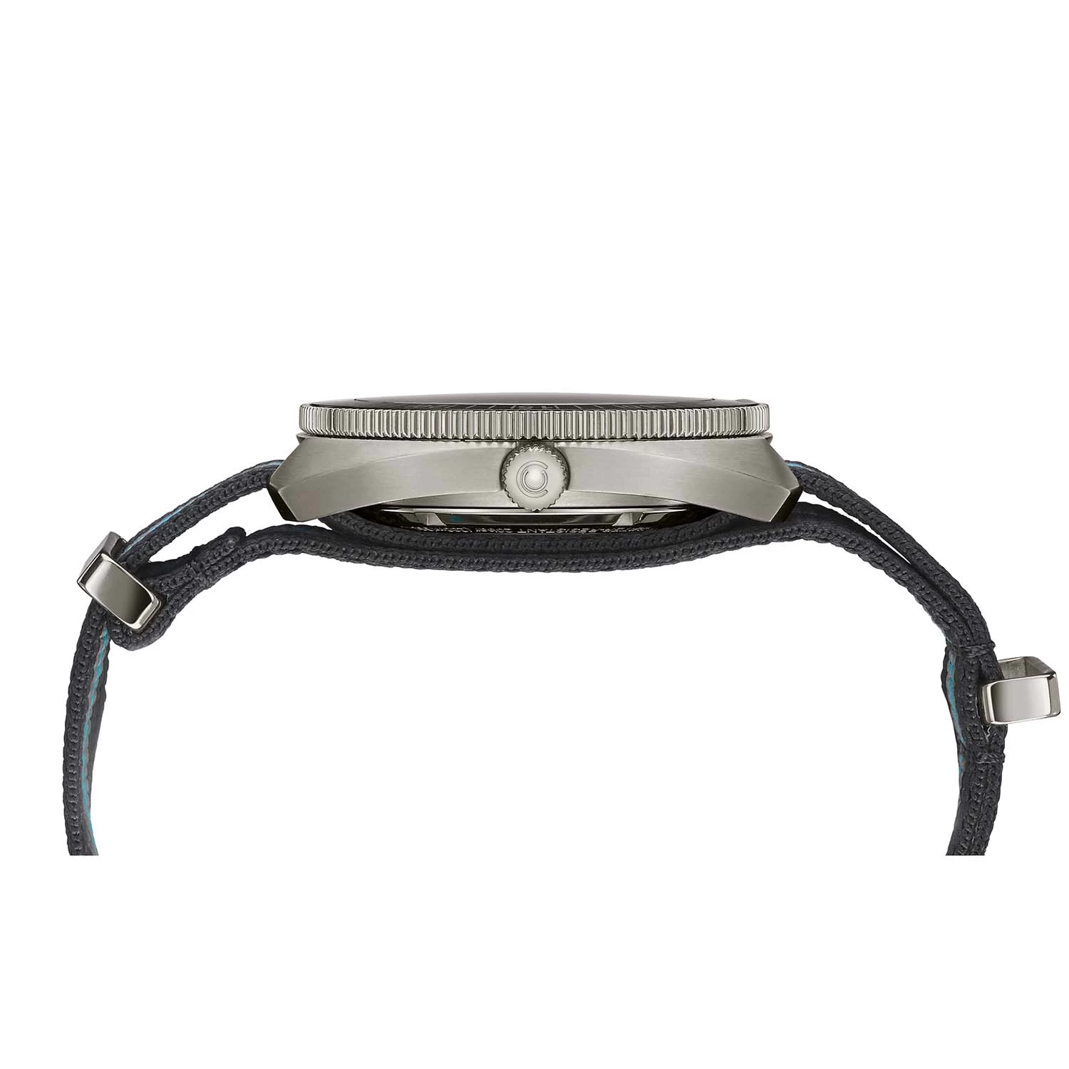 I 1960’erne satte forgængerne til DS-2 Turning Bezel standarden for robust konstruktion og moderigtig stil. Denne kollektion lever op til dette på enhver måde. Urets tonneau-formede urkasse (42 x 41 mm) har en ensrettet roterende bezel. Mens de almindelige modeller er lavet i klassisk rustfrit stål, er Sea Turtle Conservancy Edition lavet af ultralækkert titanium. Den matte sorte urskive matcher perfekt med sine rektangulære visere og Super-LumiNova belagte indekser. Denne særlige udgave bæres med et stribet sort/blå nylonrem lavet af tidevands materiale og udstyret med en titaniumspænde.