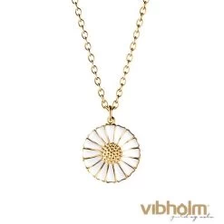 Daisy vedhæng i forgyldt sterling sølv. Margueritten måler 18 mm og er med hvid emalje. Kæde i forgyldt sterling sølv på 45 cm følger med.
