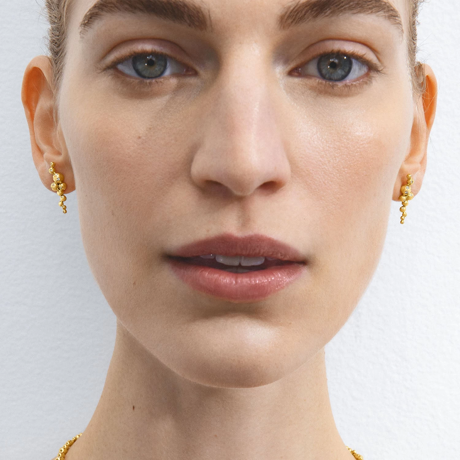 Georg Jensens nutidige fortolkning af det ikoniske Moonlight Grapes design. Øreringene består af en klynge af guldkugler med diamanter. Motivet er inspireret af druemotiverne som prydede Georg Jensens sølvhåndværk i begyndelsen af 1900-tallet.
