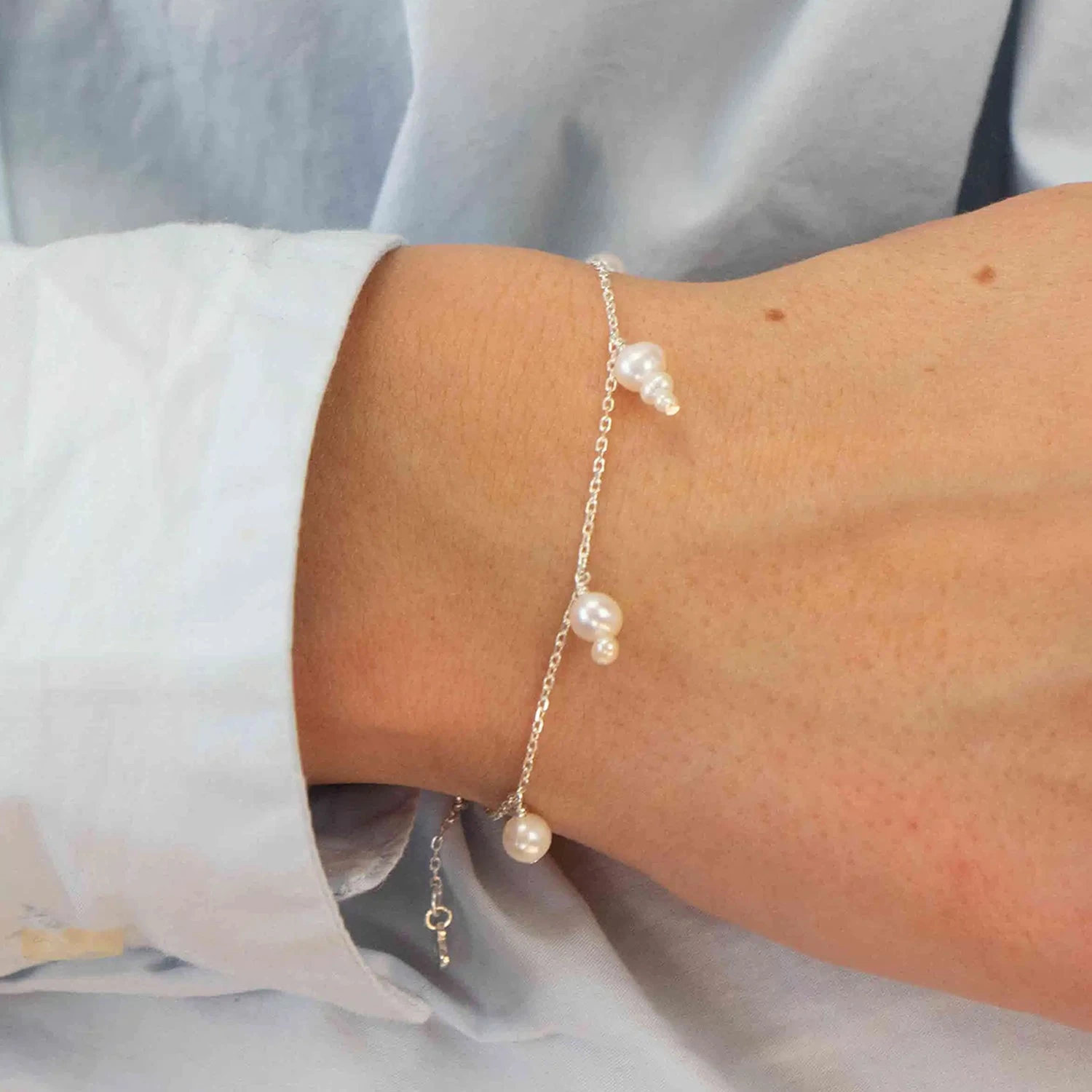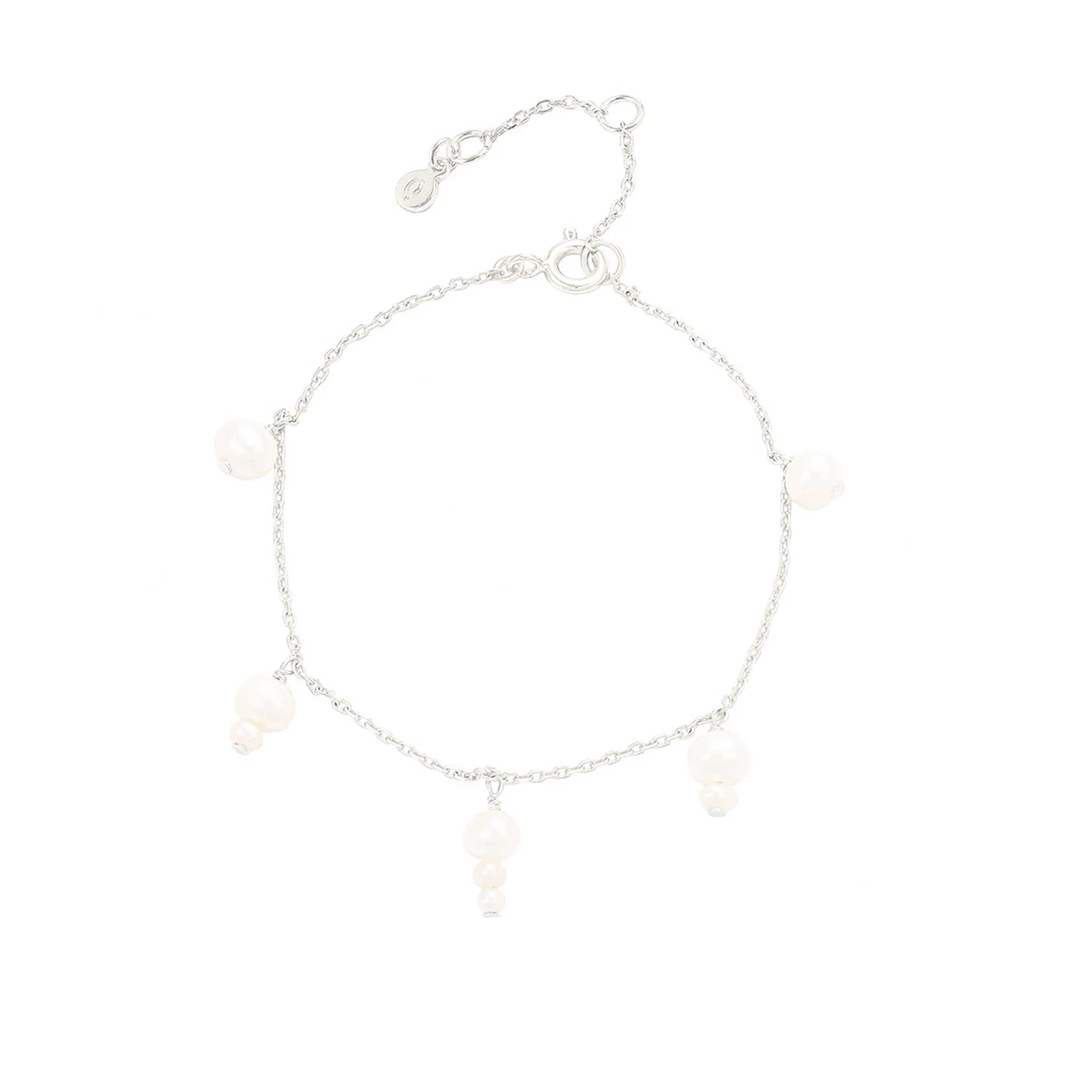 Esther armbånd fra Hultquist udført i sterlingsølv med hvide ferskvandsperler. Armbåndet er justerbar i længden 16-19 cm.