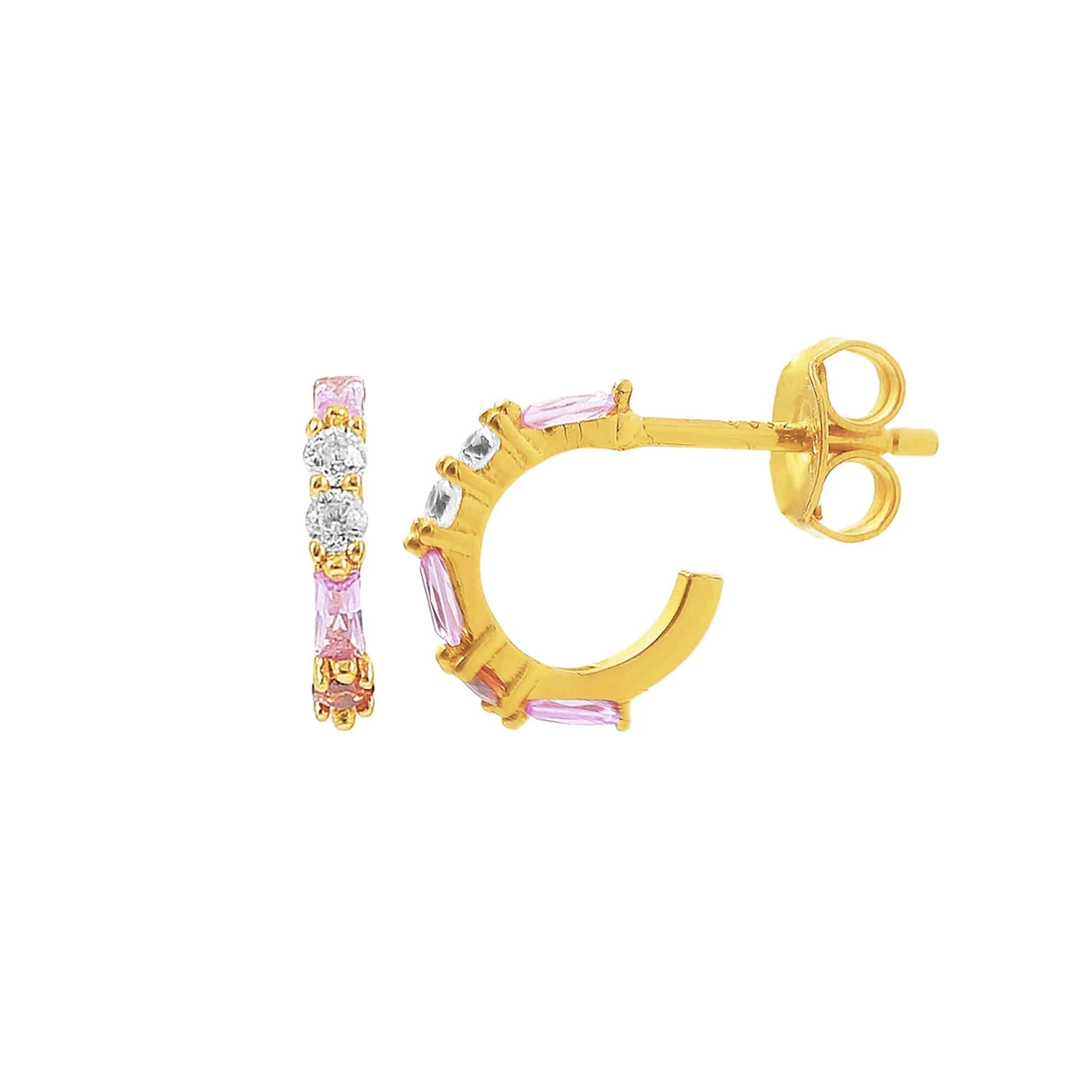 Creolerne er udført i 18 kt. forgyldt sterling sølv og er udsmykket med pinke og hvide zirkonia sten. Creolerne måler 1 cm i diameter.
