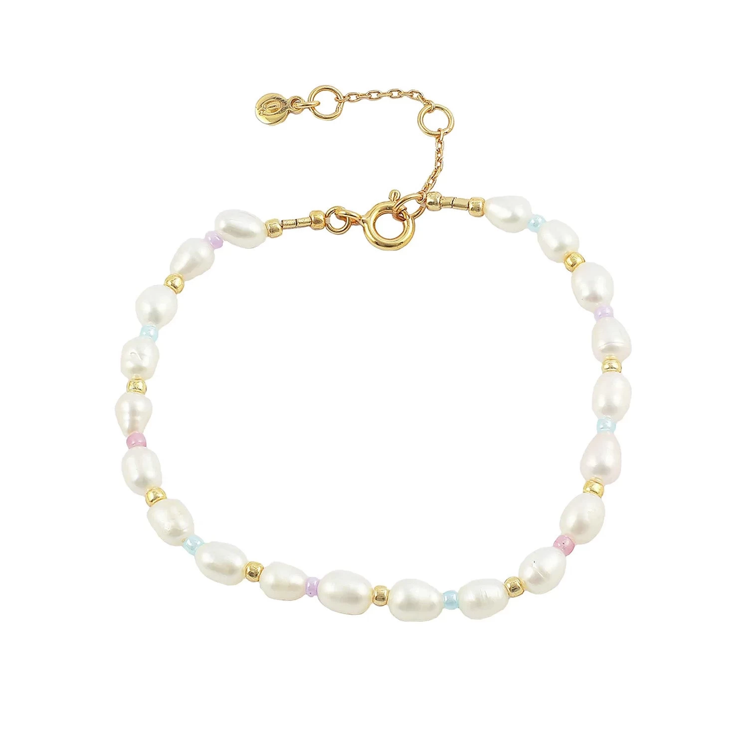Armbånd fra Hultquist udført i forgyldt sterlingsølv med pastel farvet perler og hvide ferskvandsperler. Armbåndet er justerbart fra 16-19 cm.