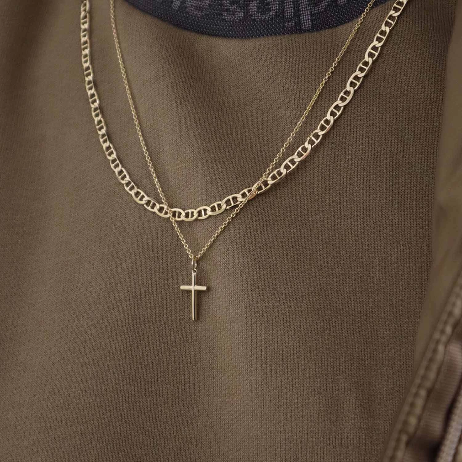 Halskæde til mænd fra Jeberg udført i forgyldt sterlingsølv med kors vedhæng. Kæden er 50 cm lang. Bær kæden alene eller style den med andre kæder.