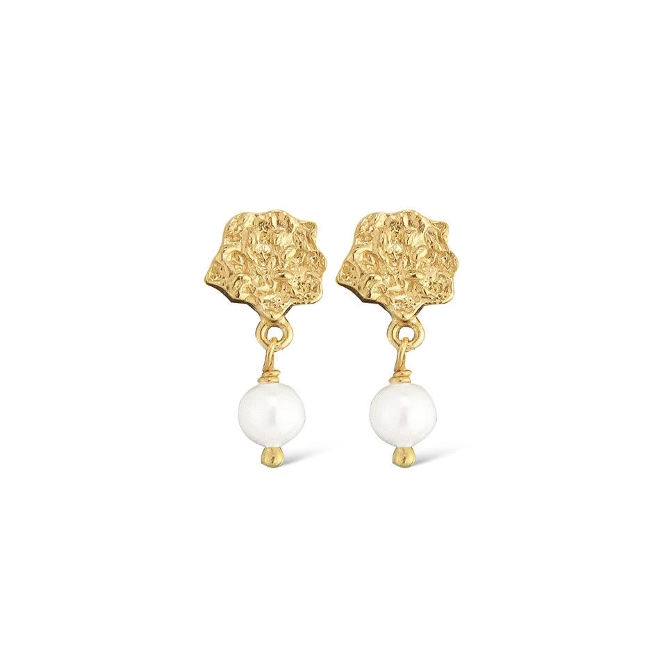 I Am Gold Mini Barok øreringe fra Jeberg udført i forgyldt sterlingsølv med banket overflade med hvide barokperler. I Am Gold kollektionen omhandler kærligheden til dig selv.