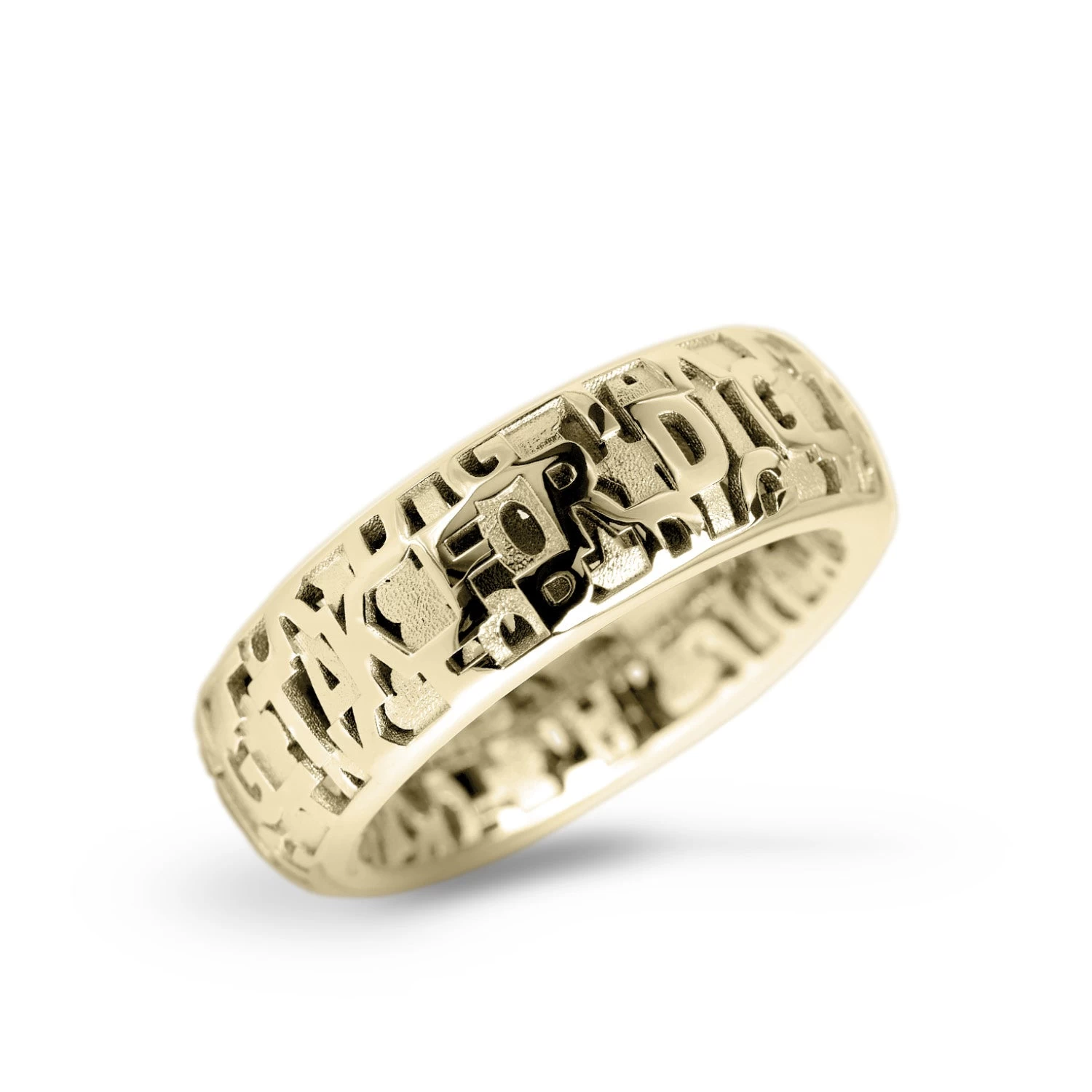 Characters Edge ring fra Luis & Freya udført i 14 karat guld med indgraveret tekst “TAK✿FOR★DIG✿”. Ringen måler 8 mm i bredden.