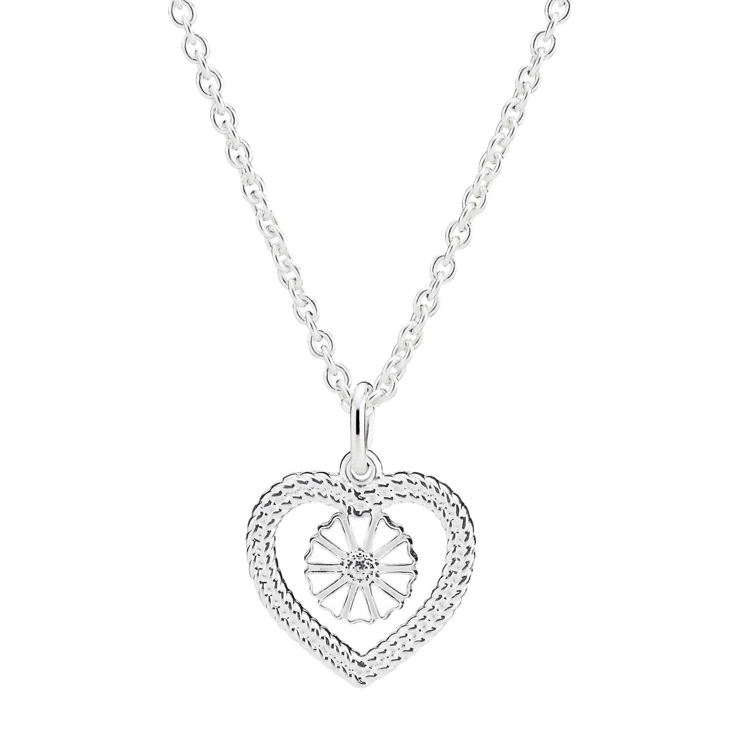 Halskæde fra Lund Copenhagen udført i sterlingsølv med et snoet hjerte og en marguerit. Halskæden er justerbar i længden 45-48 cm.