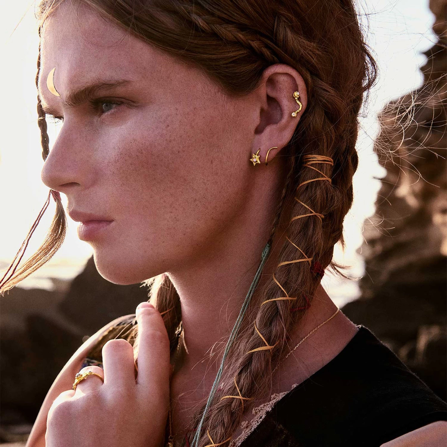 Ørestik fra Maanesten udført i forgyldt sterlingsølv med banket og snoet detalje. Ørestikken er dekoreret med klare sten.