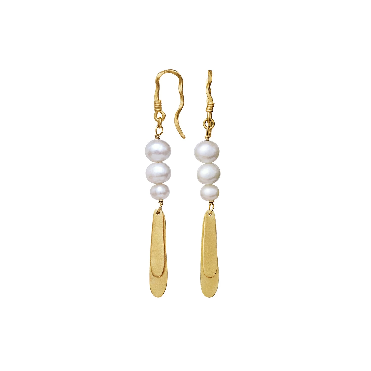 Smilla øreringe fra Maanesten udført i forgyldt sterlingsølv. Hver ørering er pyntet med tre hvide perler og et aflangt vedhæng.