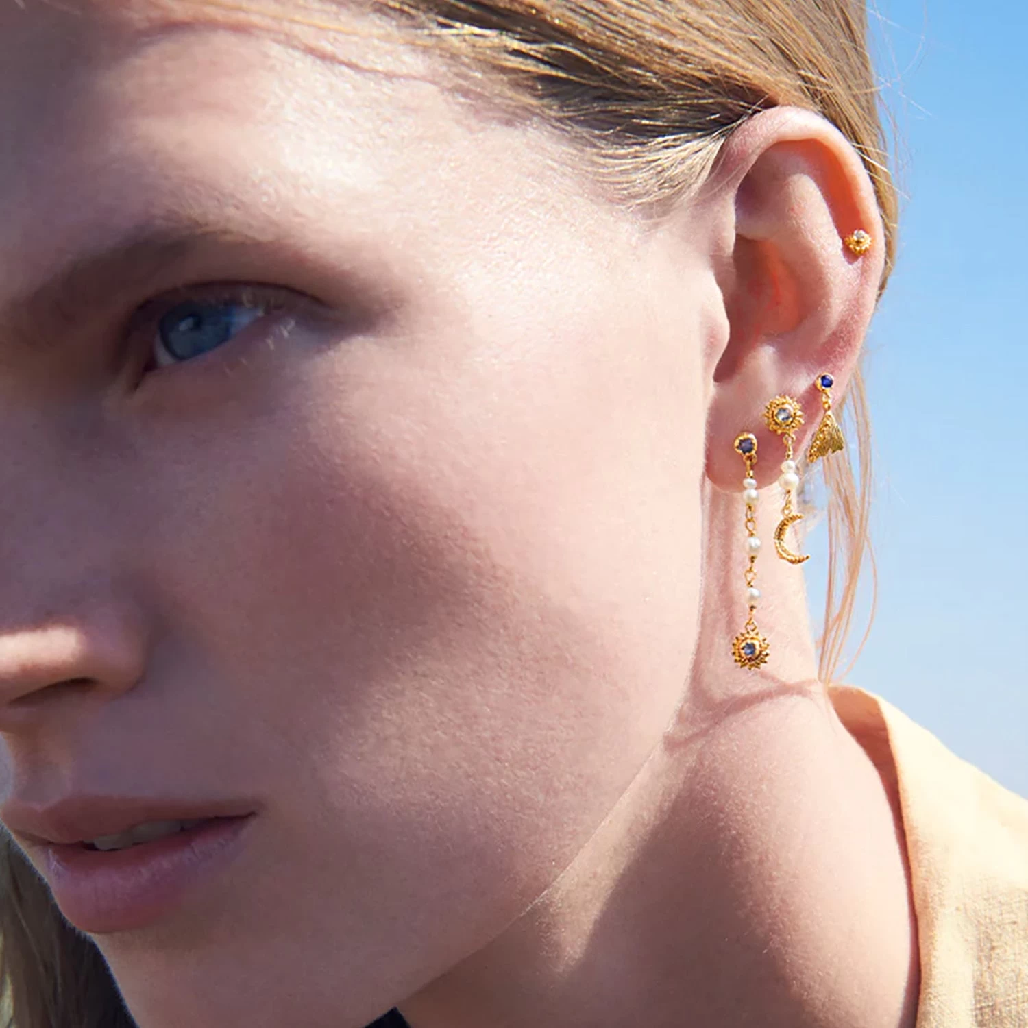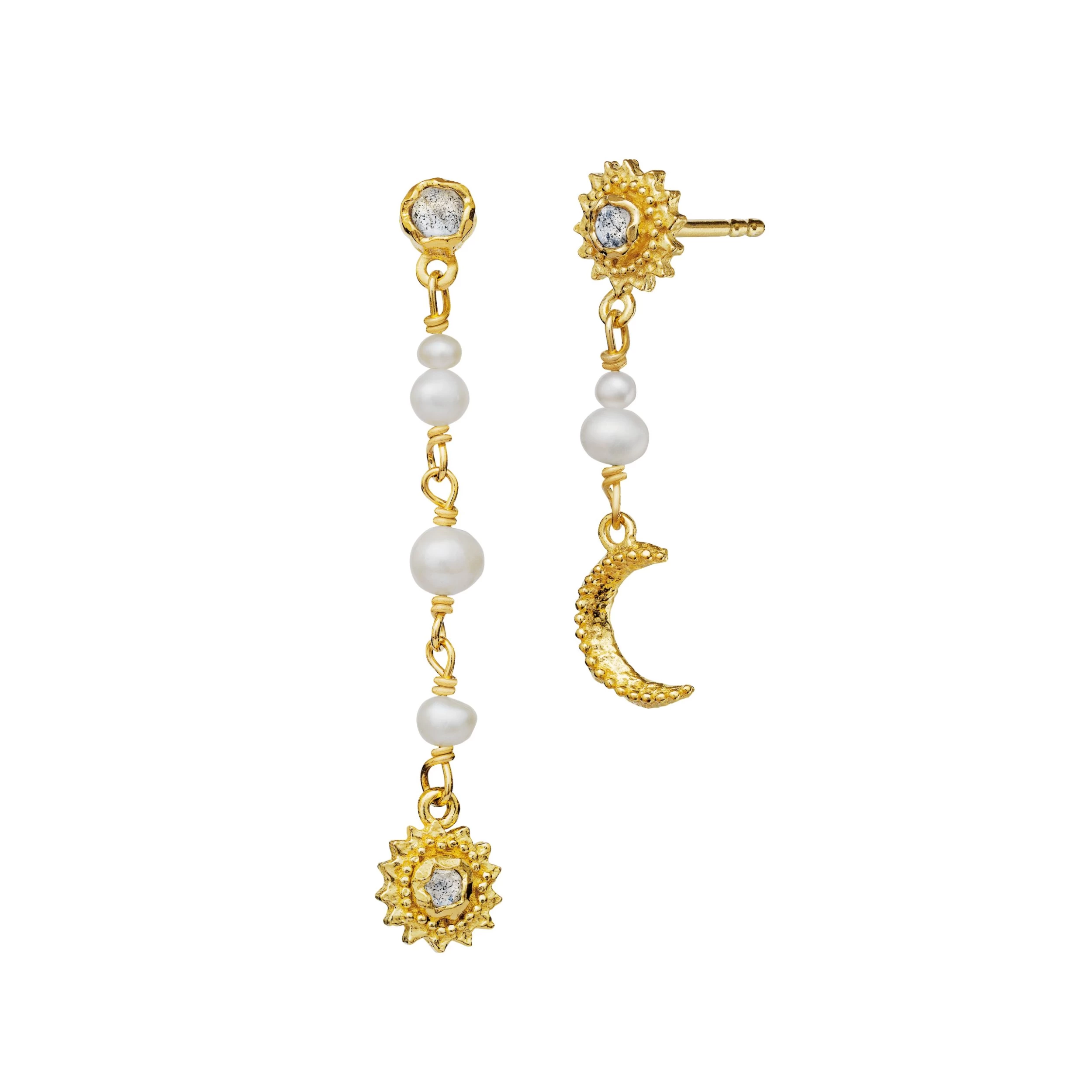Øreringe fra Maanesten i forgyldt sølv med sol og måne vedhæng og ferskvandsperler.