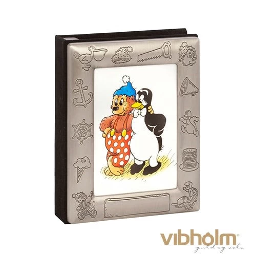 Flot fotoalbum fra Nordahl Andersen i fortinnet stål med Rasmus Klump motiver. Oplagt som dåbsgave.