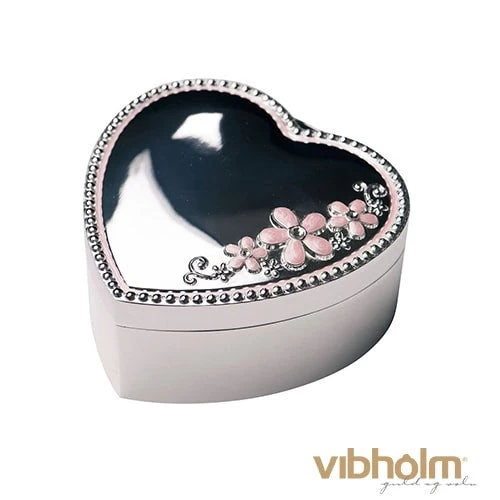 Flot smykkeskrin fra Nordahl Andersen i krom med hjerteform og musik. Den oplagte dåbsgave.