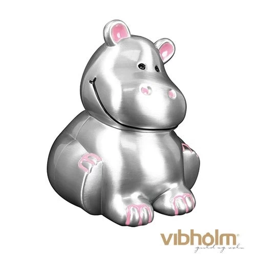 Sød fortinnet sparebøsse fra Nordahl Andersen formet som flodhest med lyserød emalje. Den perfekte dåbsgave til pigen.