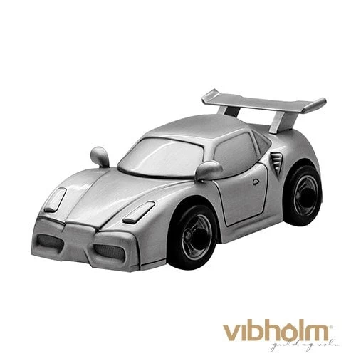 Fin fortinnet sparebøsse fra Nordahl Andersen formet som racerbil. Den perfekte dåbsgave.