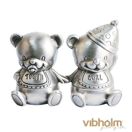 Pæne tand- og hårlok skrin fra Nordahl Andersen i fortinnet stål med form som bamser. Den oplagte dåbsgave.
