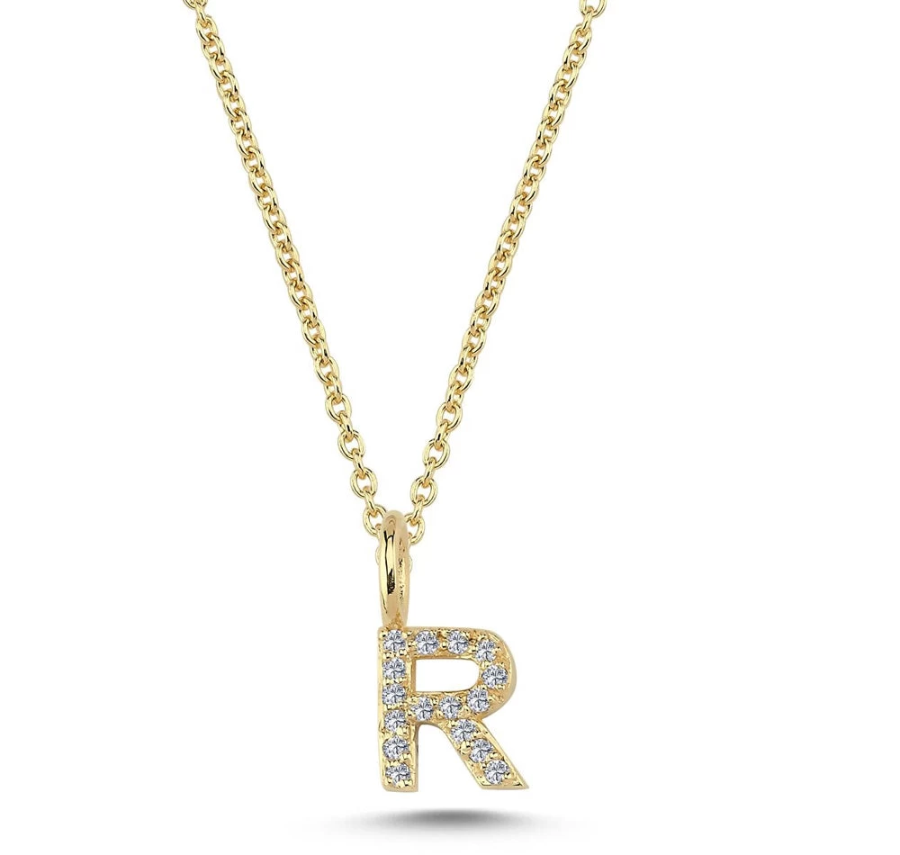 Vedhæng med bogstavet R fra Nuran udført i 14 karat rødguld med diamant pavé – i alt 16 x 0,005 ct. w/si.