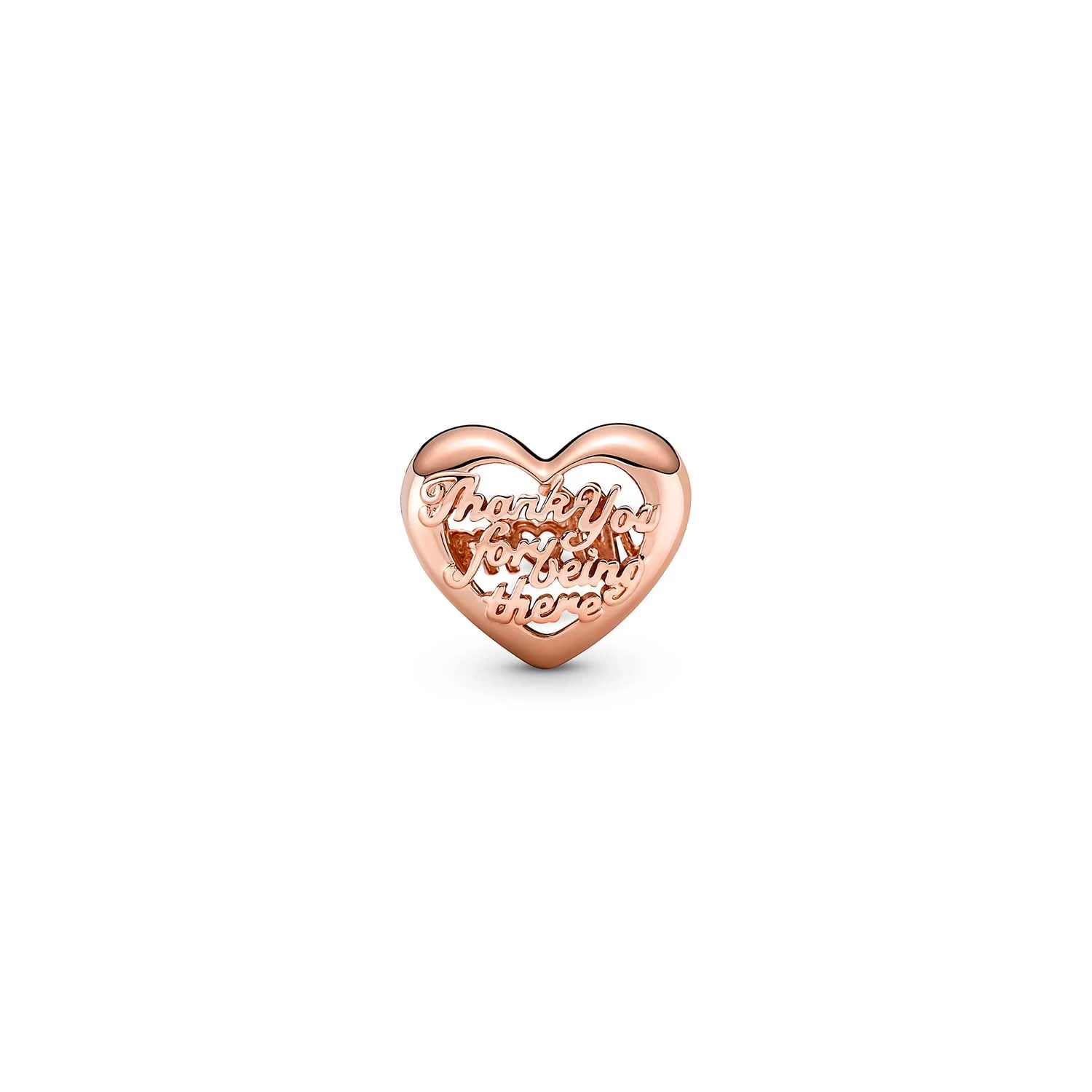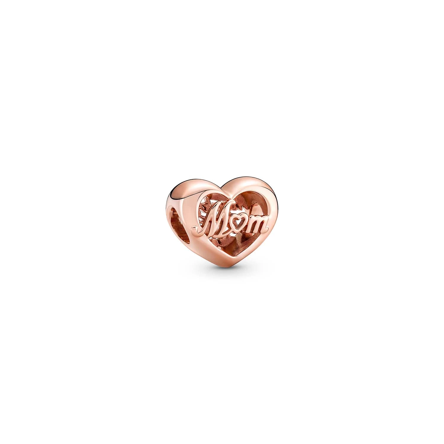Charm fra Pandora i rosa forgyldt metalblanding med teksten “mom”.