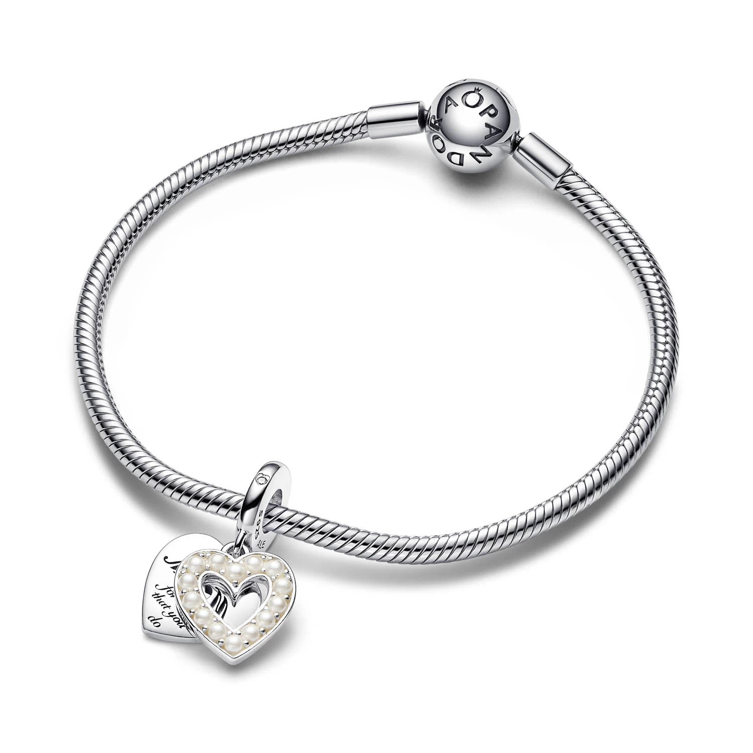 Pearlescent White Heart charm fra Pandora udført i sterlingsølv med kunstigt fremstillede sten i bioresin.