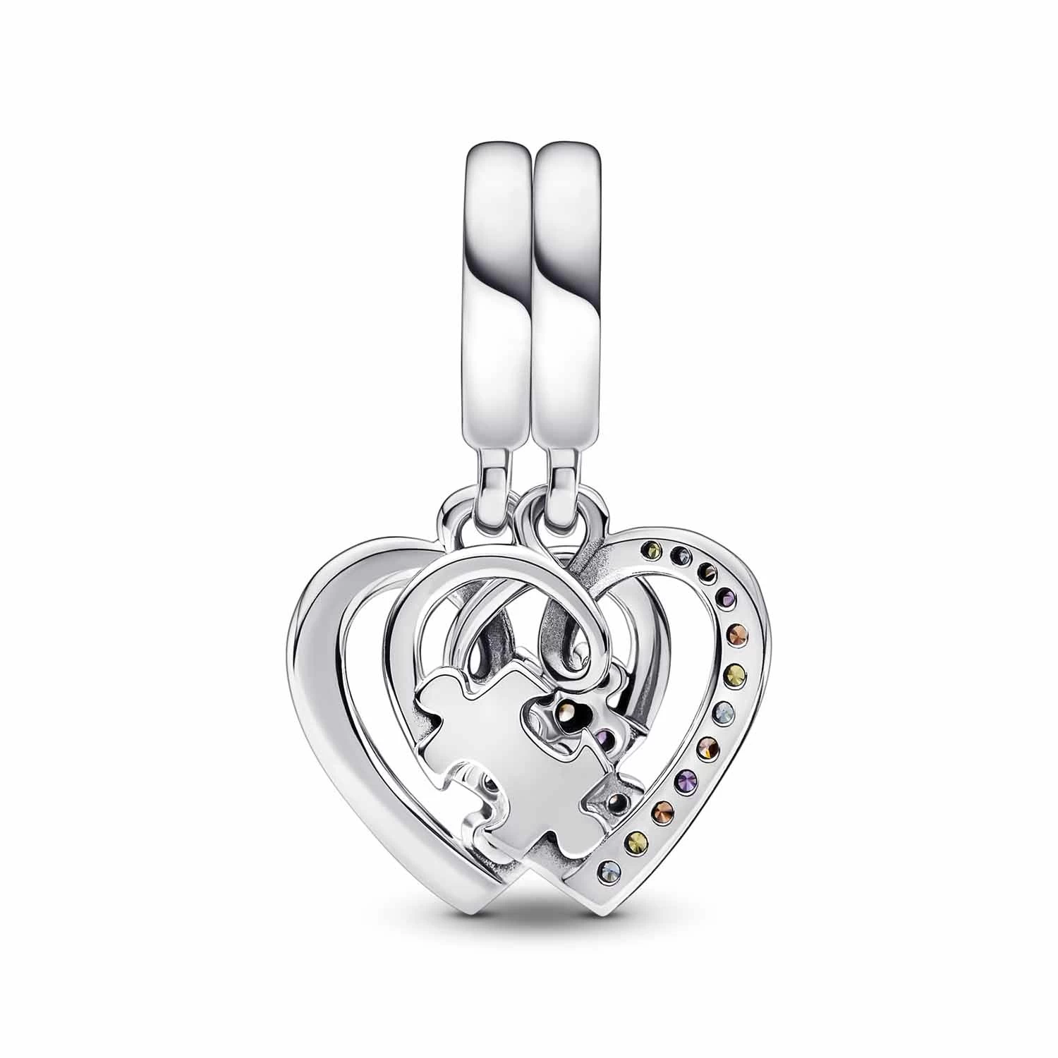 Venskabscharm fra Pandora udført i sterlingsølv med to hjerter dekoreret med farverige sten og ordene “My Missing Piece” og “Best Friends”.