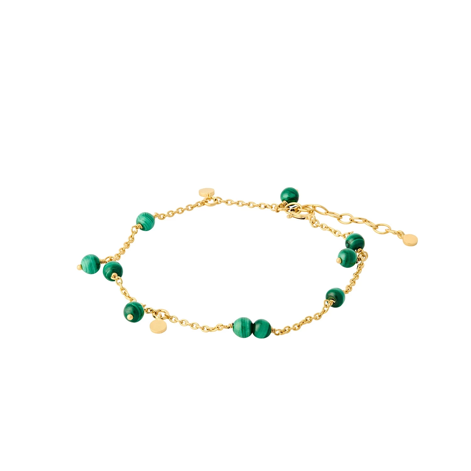 Forest armbånd fra Pernille Corydon udført i forgyldt sterlingsølv med grønne malakit-sten. Armbåndet er justerbar i længden 16-19 cm.