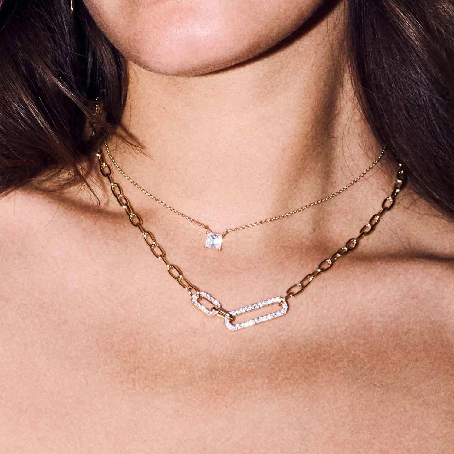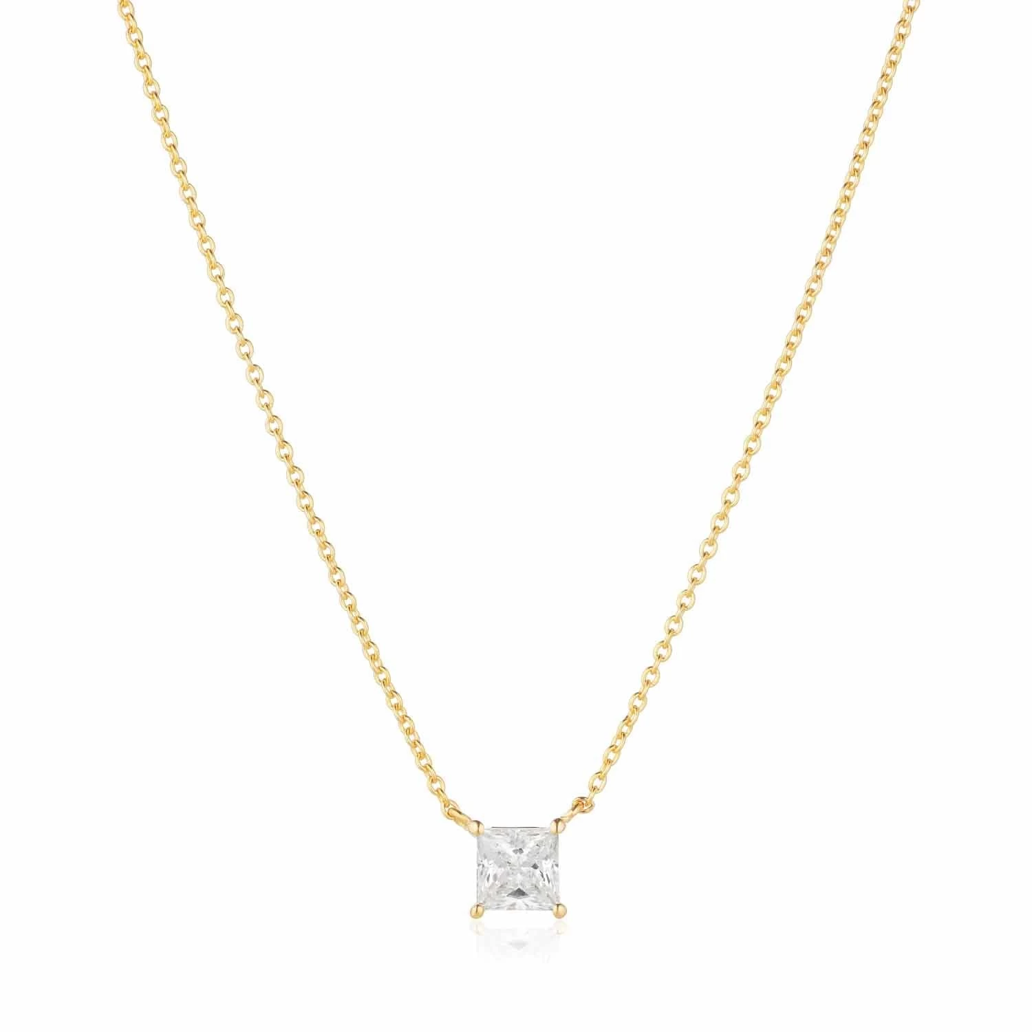 Ellera Quadrato halskæde fra Sif Jakobs udført i forgyldt sterlingsølv med én stor hvid zirkonia sten. Style halskæden alene eller stack den med andre kæder.