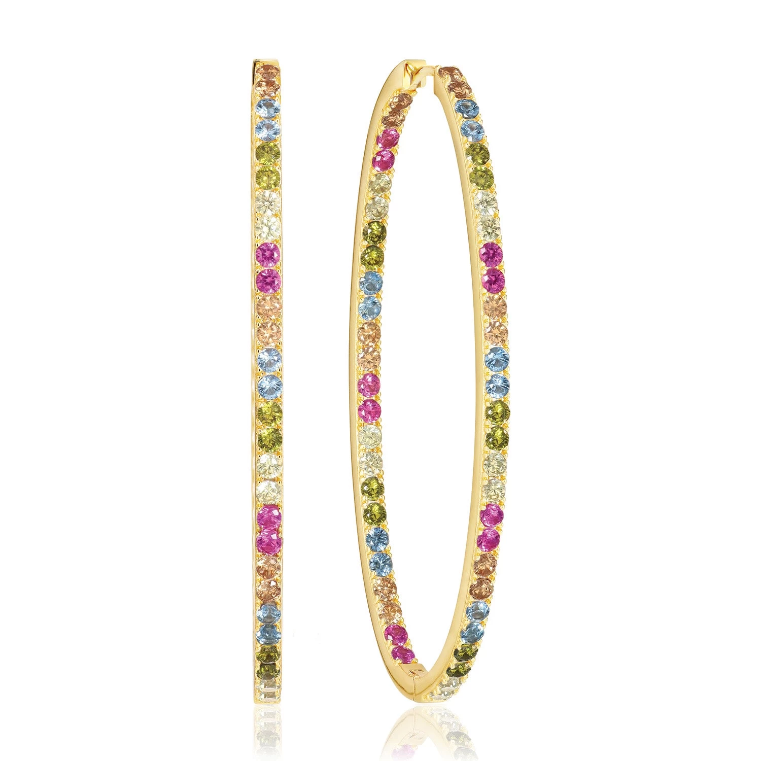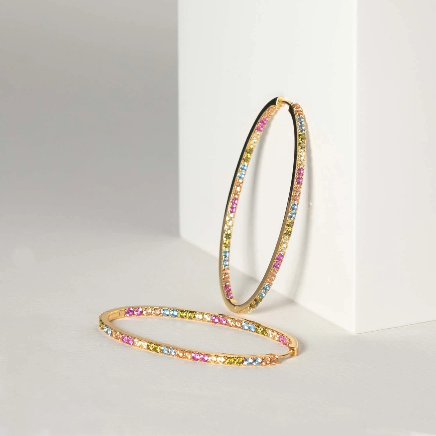 Ellisse Grande øreringe fra Sif Jakobs. Øreringene er udført i 18 karat forgyldt sterlingsølv med en blankpoleret overflade og håndsatte facetslebne multifarvede zirkoner. Øreringene har en diameter på 60 mm.