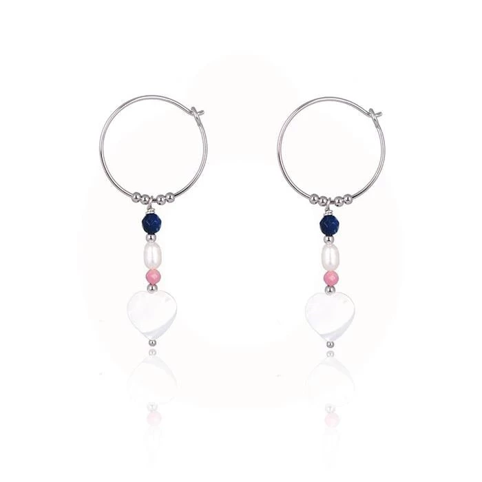 Fine creoler fra WiOGA i sølv med halvædelsten, ferskvandsperle og hjertevedhæng i perlemor.